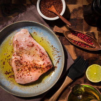 Хороший кусок меч-рыбы (я всегда беру довольно большой, потому что этим блюдом обед как начнется, так и закончится) замариновать на полчаса в оливковом масле, соке лайма, тмине и розовом перце. Отдельно порезать мелко спелые помидоры и авокадо.